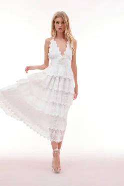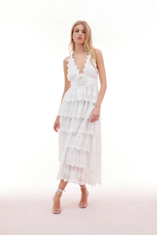 Make an entrance in the Nevis Dress. This statement piece stuns with an airy, cotton voile fabric with eyelet detail all over. All in the detail, the dress begins with a halter neckline outlined with a scallop edge that criss-crosses in the back. A fabric rosette adorns the center front before falling to the epic, multi-tiered skirt. The dress has an elasticated waist for easy wear.