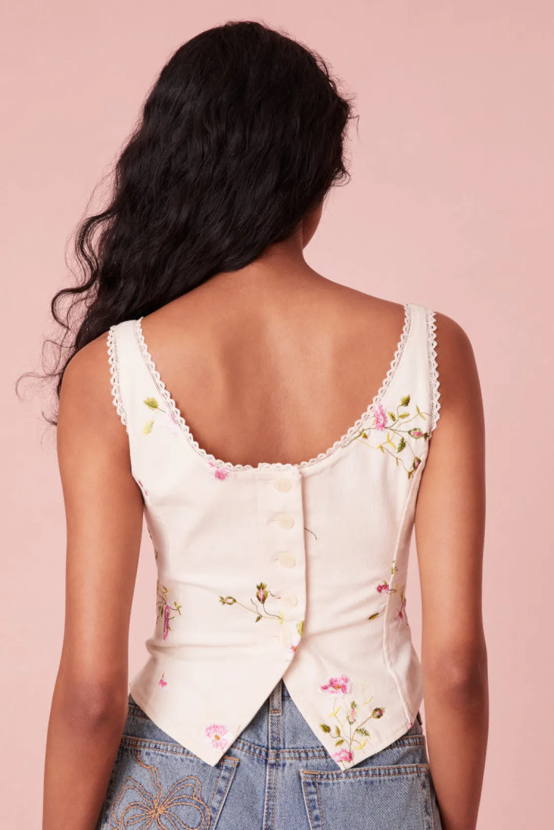 Effortlessly chic in the Rhapsody Bustier. This must-have, lightweight top is designed from a stretch twill fabric with a pink winding floral print all over. The Victorian-inspired bustier features a lace trim at the neckline, boning details for structure, and buttons for closure on the back. The flattering top pairs best with a mini or your favorite pair of vintage jeans.