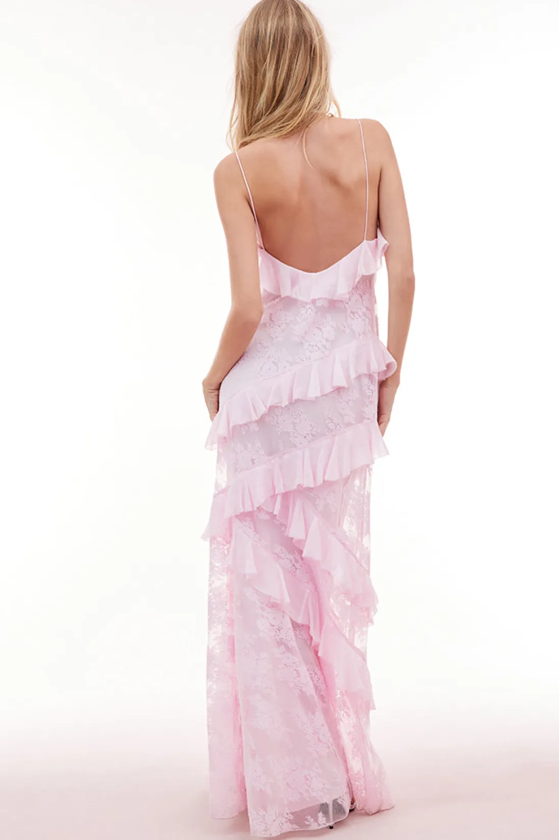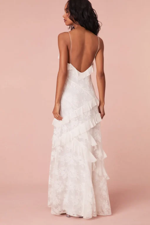 Our best-selling Rialto Dress returns for the season designed with floral applique lace all over giving this fan-favorite a delicate look. This stunning maxi features a subtle amount of sheerness giving it a slightly sexy, but still modest look. The piece features overlapping, asymmetrical ruffles at the neckline that continue to descend through the entire skirt. Slightly fitted, the dress includes a side seam zipper for closure.