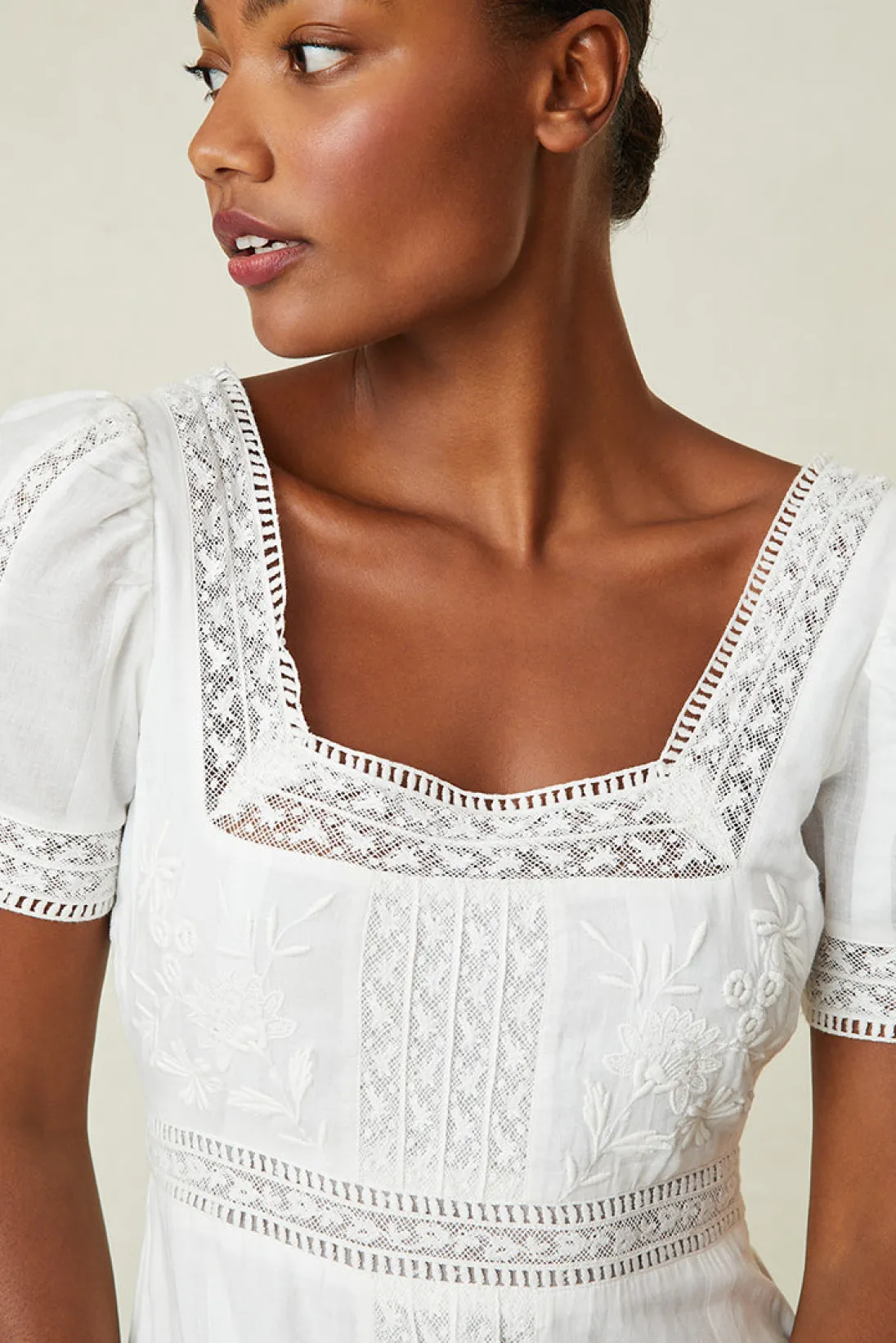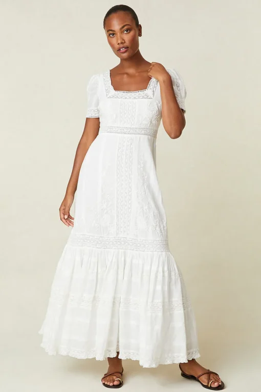 Our fan favorite Ryan Dress returns as part of our limited-edition Anniversary Collection. This special piece from our signature Heritage Collection features a lightweight cotton fabric with mixed custom lace detail and intricate embroideries all over. The maxi dress has a square neckline, short vintage-inspired sleeves, a fitted bodice, and an airy skirt.