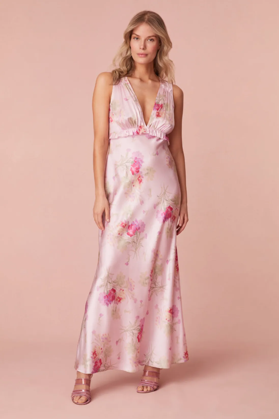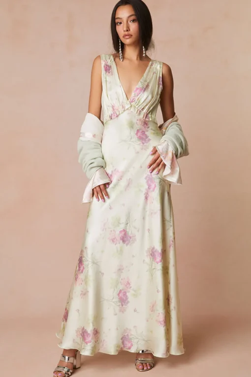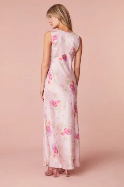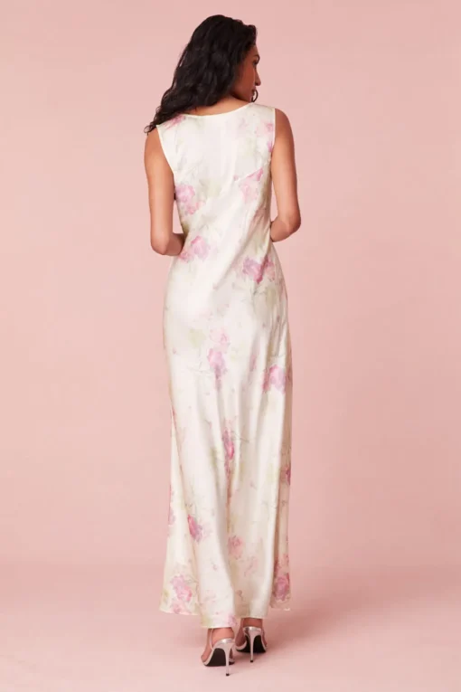 Subtly sexy in our Suniva Dress. This dreamy maxi is designed from a soft, silk charmeuse fabric with our new pretty in pink bouquet print all over. With a drapey silhouette, the stunning dress features a v-neckline, a ruched bodice for a flattering fit before falling to a body-skimming, bias cut skirt.</div