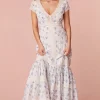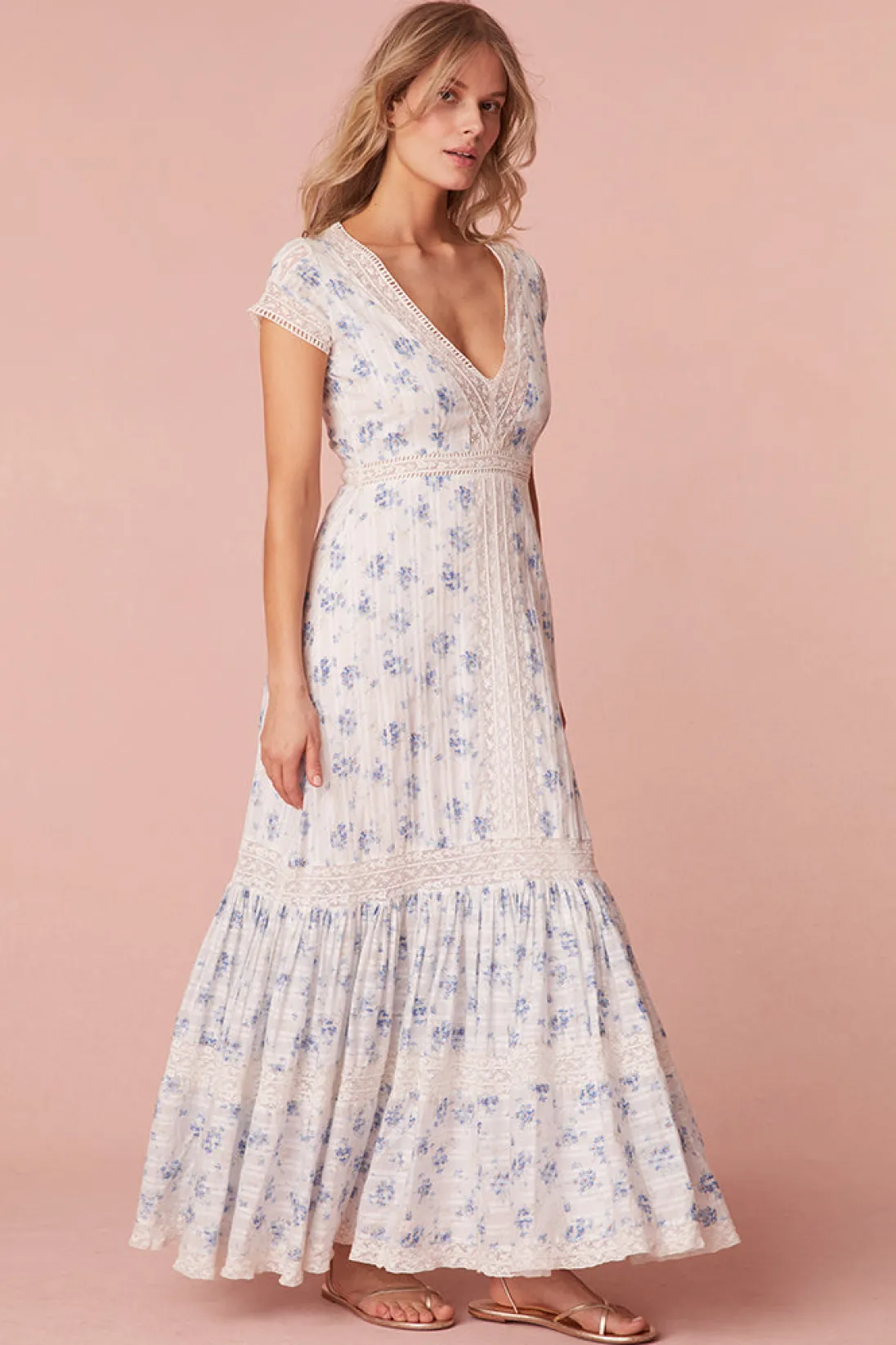 Introducing the Vermella Dress. Our dream springtime frock makes her debut with an airy, cotton fabric featuring our dreamy blue floral print of the season and intricate, lace detail all over. The midi begins with short sleeves and a v-neckline lined with lace that descends down center front into a sweeping, pleated skirt with lace insets that falls to a lace hem.
