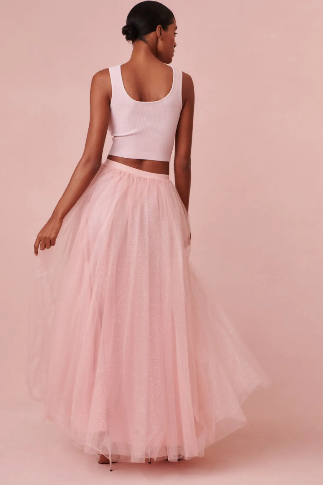 A dream comes to life with the Wilona Skirt. The stunning evening skirt is inspired by the 80’s with a soft tulle that’s structural and lovely to wear. Perfect for your next holiday party, the pink pall skirt features silk glitter all over for a shimmer effect and has a satin waistband at the elastic waist for an easy, pretty pull-on.